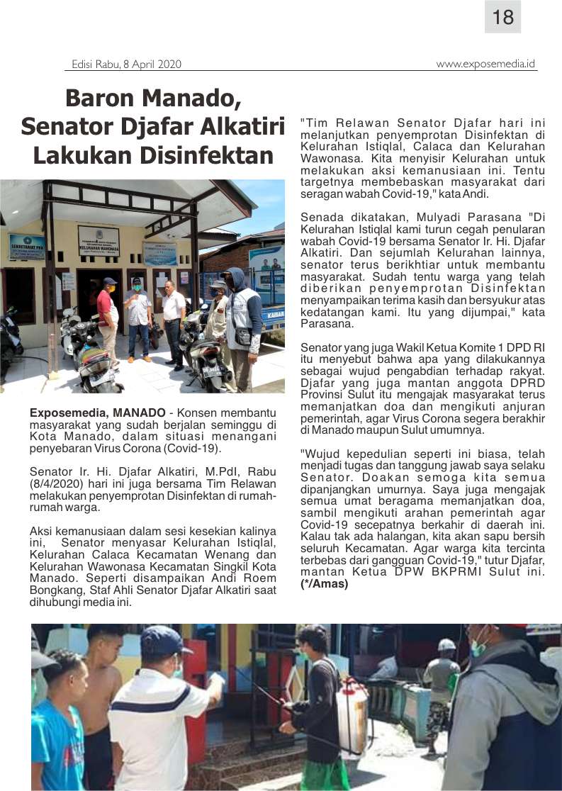 Exposemedia, MANADO – Konsen membantu masyarakat yang sudah berjalan seminggu di Kota Manado, dalam situasi menangani penyebaran Virus Corona (Covid-19). Senator Ir. Hi. Djafar Alkatiri, M.PdI, Rabu (8/4/2020) hari ini juga bersama Tim Relawan melakukan penyemprotan Disinfektan di rumah-rumah warga.