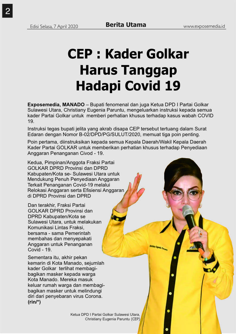 EXPOSEmedia, MANADO – Bupati fenomenal dan juga Ketua DPD I Partai Golkar Sulawesi Utara, Christiany Eugenia Paruntu, mengeluarkan instruksi kepada semua kader Partai Golkar untuk memberi perhatian khusus terhadap kasus wabah COVID 19.
