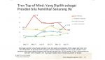 Dalam pertanyaan terbuka atau top of mind, di mana responden menyebutkan nama calon presiden yang mereka dukung secara spontan, Ganjar menempati urutan pertama dengan dukungan 17,6 persen, disusul Prabowo Subianto 12,6 persen, Joko Widodo 12,5 persen, Anies Baswedan 9,1 persen, Ridwan Kamil 4,3 persen, dan nama-nama lain di bawah 2 persen. Masih ada 32,4 persen warga yang belum menyebutkan nama calon pada pertanyaan terbuka ini.