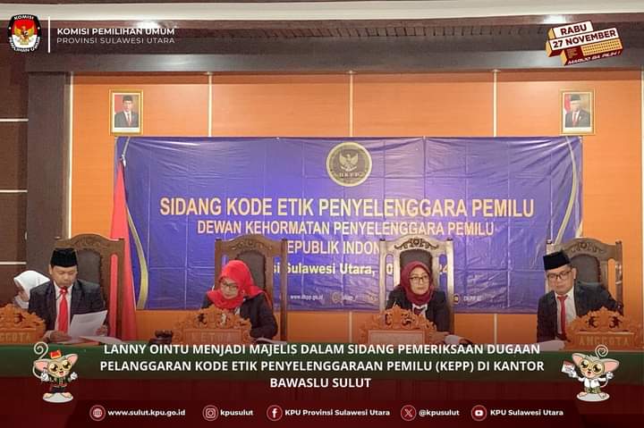 EXPOSEMEDIA, MANADO—Sidang pemeriksaan dugaan pelanggaran Kode Etik Penyelenggara Pemilu (KEPP) dengan perkara bernomor 50-PKE-DKPP/III/2024 yang digelar di Kantor Bawaslu Sulut, Kamis (30/05/2024) diikuti Komisioner KPU Sulut, Lanny Ointu yang menjadi salah satu anggota majelis.