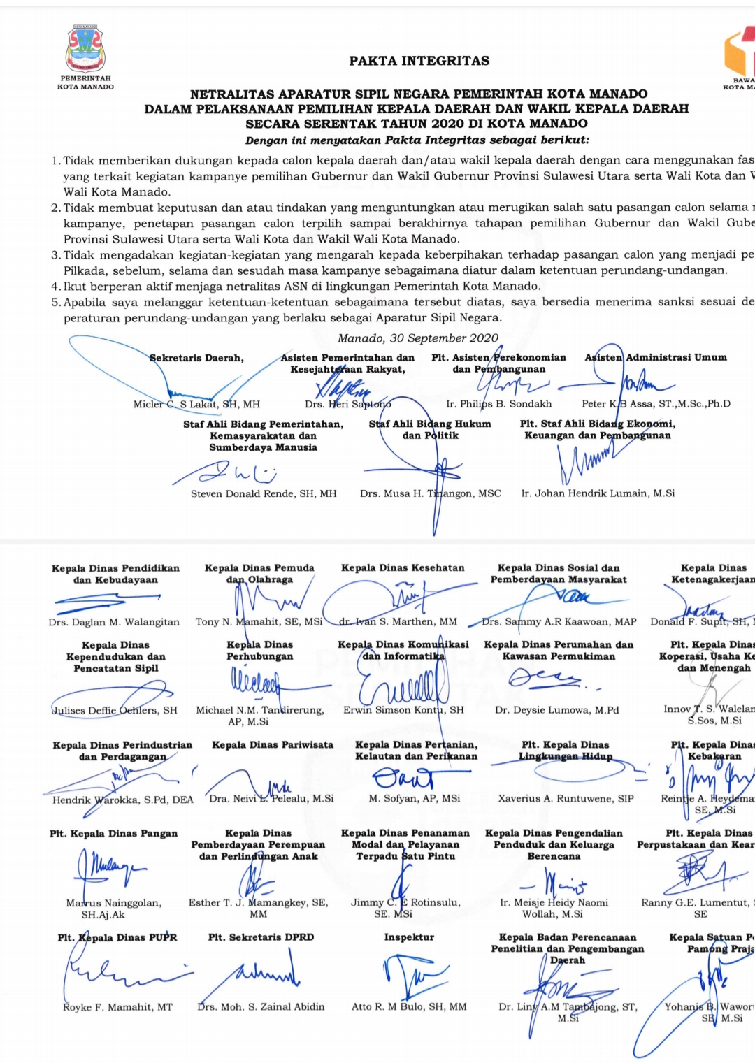 Pakta Integritas yang turut ditandatangani Walikota Manado GS. Vicky Lumentut, dan Ketua Bawaslu Manado Marwan Kawinda, dan jajaran pejabat eselon di Pemkot Manado itu, berisi lima poin penting, diantaranya ;