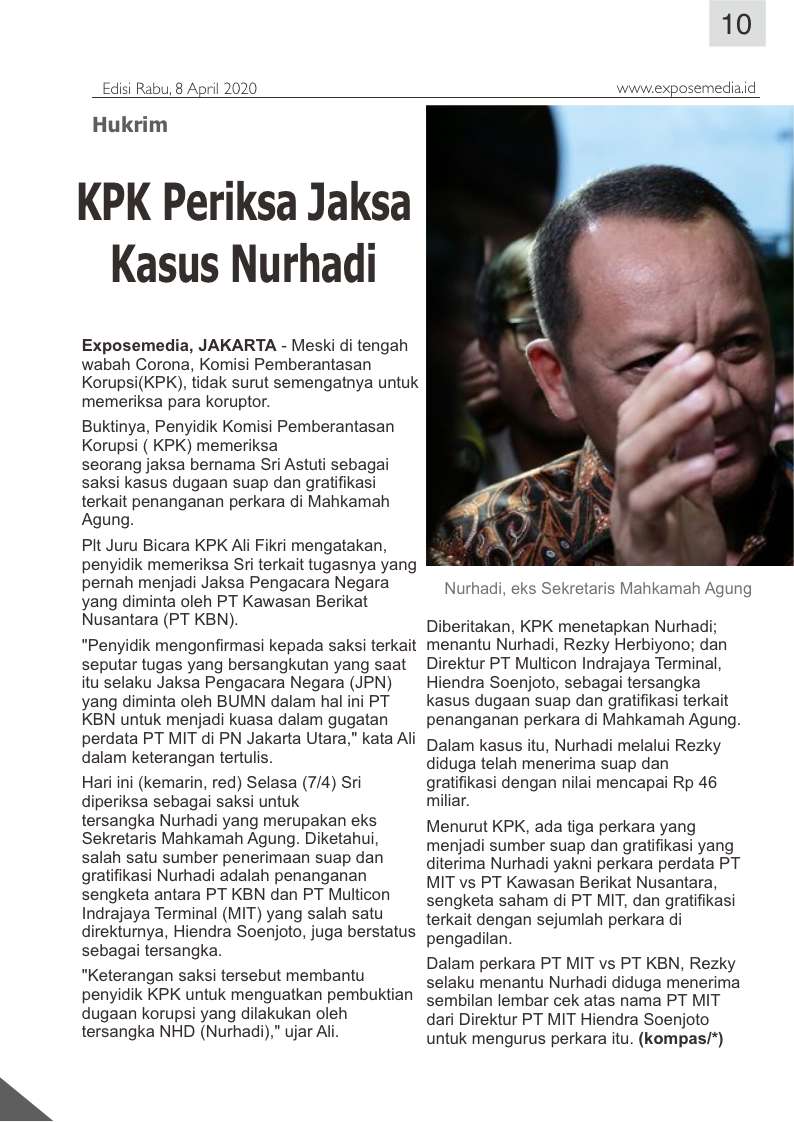 Hari ini (kemarin, red) Selasa (7/4) Sri diperiksa sebagai saksi untuk tersangka Nurhadi yang merupakan eks Sekretaris Mahkamah Agung. Diketahui, salah satu sumber penerimaan suap dan gratifikasi Nurhadi adalah penanganan sengketa antara PT KBN dan PT Multicon Indrajaya Terminal (MIT) yang salah satu direkturnya, Hiendra Soenjoto, juga berstatus sebagai tersangka.