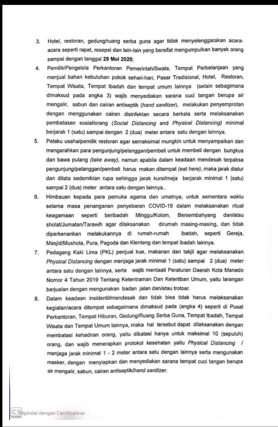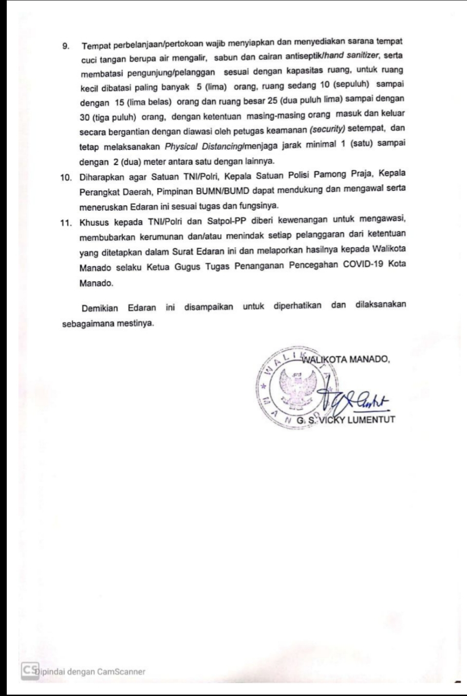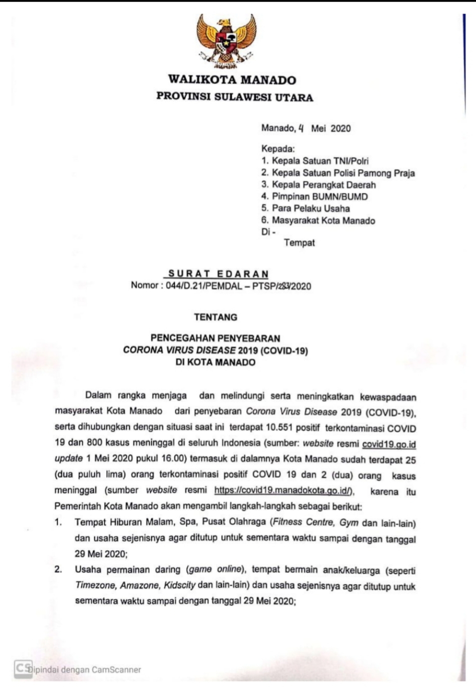Namun begitu, pemerintah Kota Manado, tetap mengambil langkah tanggap persuasif dengan mengeluarkan Surat Edaran Nomor: 044/D.21/PEMDAL-PTSP/283/2020 tentang Pencegahan Penyebaran Corona Virus Disease 2019 (COVID-19) di Kota Manado. (rin/*)