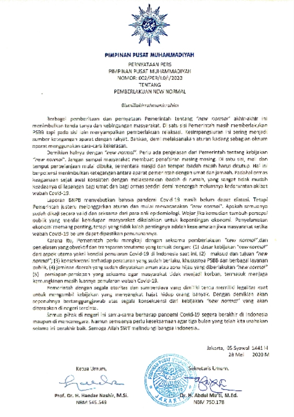 Demikian poin penting dari Pernyataan Pers PP Muhammadiyah, Dalam surat bernomor: 002/PER/l.O/l/2020 tentang Pemberlakukan New Normal yang dibuat di Jakarta, 05 Syawal 1441 H/28 Mei 2020 M dan ditandatangani Ketua Umum Prof Dr H Haedar Nashir MSI dan Sekretaris Umum Dr Abdul Mu’ti MEd.