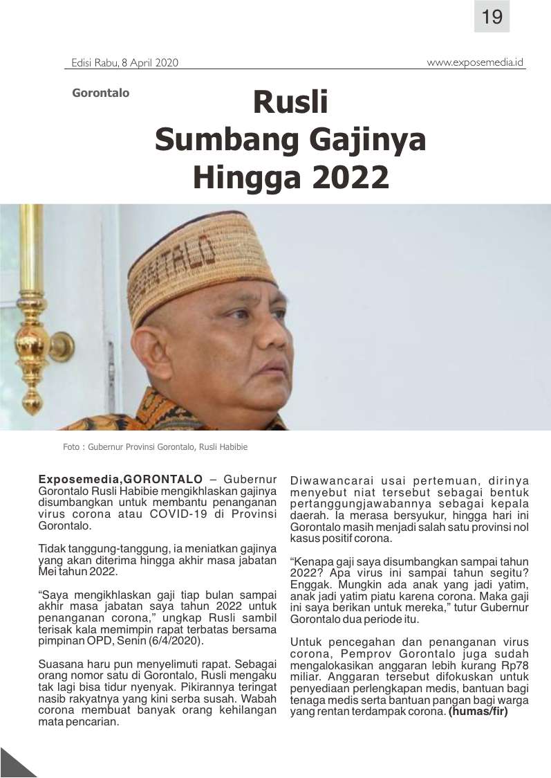 EXPOSEMEDIA.ID, GORONTALO – Gubernur Gorontalo Rusli Habibie mengikhlaskan gajinya disumbangkan untuk membantu penanganan virus corona atau COVID-19 di Provinsi Gorontalo.