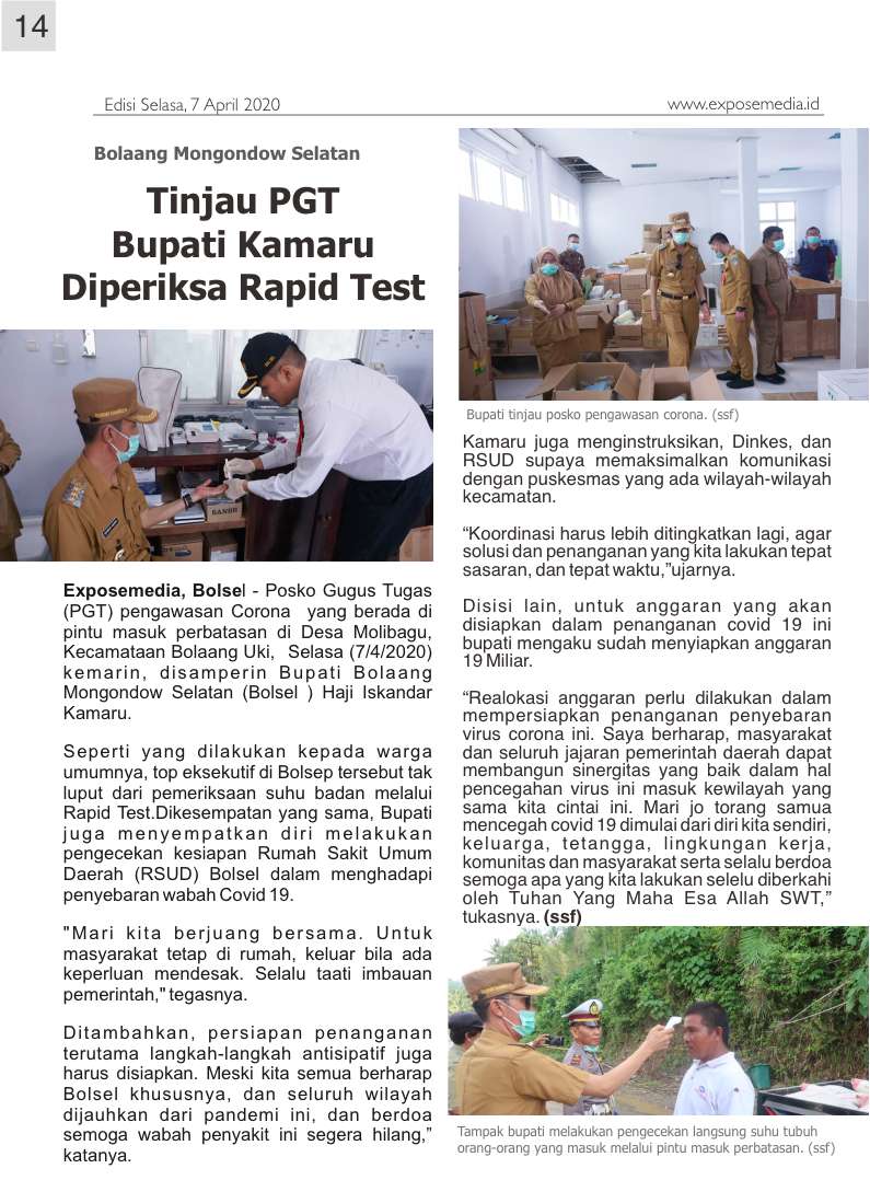 Seperti yang dilakukan kepada warga umumnya, top eksekutif di Bolsep tersebut tak luput dari pemeriksaan suhu badan melalui Rapid Test.Dikesempatan yang sama, Bupati juga menyempatkan diri melakukan pengecekan kesiapan Rumah Sakit Umum Daerah (RSUD) Bolsel dalam menghadapi penyebaran wabah Covid 19.