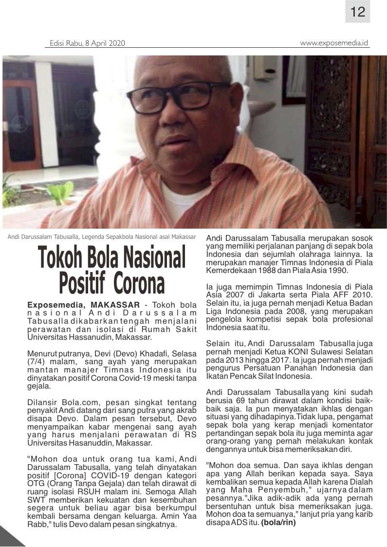 EXPOSEmedia, MAKASSAR – Tokoh bola nasional Andi Darussalam Tabusalla dikabarkan tengah menjalani perawatan dan isolasi di Rumah Sakit Universitas Hassanudin, Makassar.